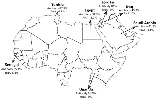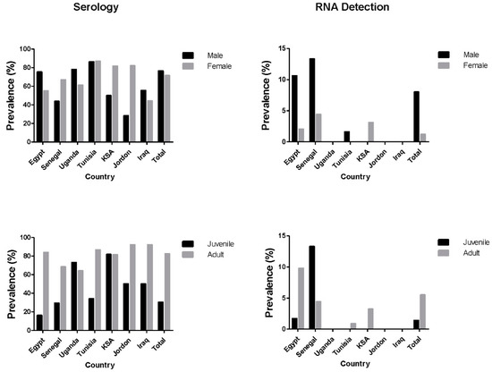 The overall seroprevalence of MERS-CoV antibodies in all collected sera (3821 samples) from the seven countries (Egypt, Uganda, Senegal, Tunisia, Jordan, KSA, and Iraq) as illustrated in Figure 1 was 73.7% with seroprevalence of 30.3% in juvenile (<2 years old) and 82.6% in adult camels (>2 years old) (Figure 2). The prevalence rate of MERS-CoV RNA in 4331 nasal swabs collected from the seven countries was 4.7%, with virus detection rates of 5.5% and 1.4% in adult and juvenile, respectively. Male camels had a significantly higher detection rate of MERS-CoV than female camels (8% and 1.2%, respectively, p-value < 0.001) (Figure 2). No significant difference in the seroprevalence of MERS-CoV antibodies in male and female camels was detected (76.5% and 71.5%, respectively).