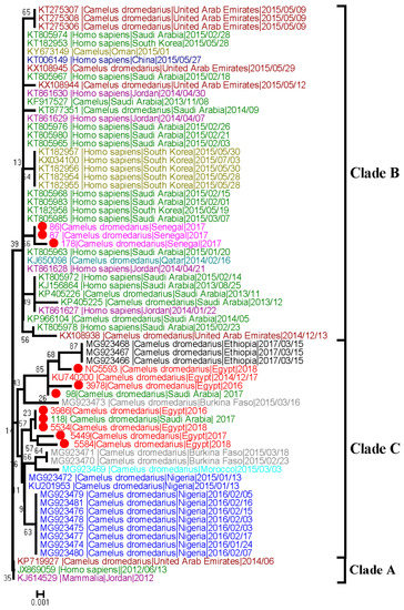 Phylogenetic analysis of partial spike nucleotide sequences containing RBD showed that MERS-CoV in camels in Egypt clusters together with African MERS-CoV in a clade C. Previous studies found that MERS-CoV circulating in dromedaries in Egypt, Burkina Faso, Nigeria, Morocco, and Ethiopia are genetically distinct from viruses in the Arabian Peninsula [28,29]. Interestingly, the obtained sequences from infected camels with MERS-CoV in KSA were distinct from previously detected MERS-CoV in Arabian Peninsula and closely related to clade C of the African detected viruses. The detected viruses were from Al-Khomra near Jeddah. Most of camels in this region were imported from Sudan and Somalia suggesting the role of imported camels in the emerging of this clade into KSA. In contrast to data from a previous study [28], the three obtained sequences from Senegal in West Africa were peculiarly related to cluster B circulating in Asia. It is important to note that those findings may have been affected by the relatively short sequenced fragment and full genome sequences of these samples will be more realistic.