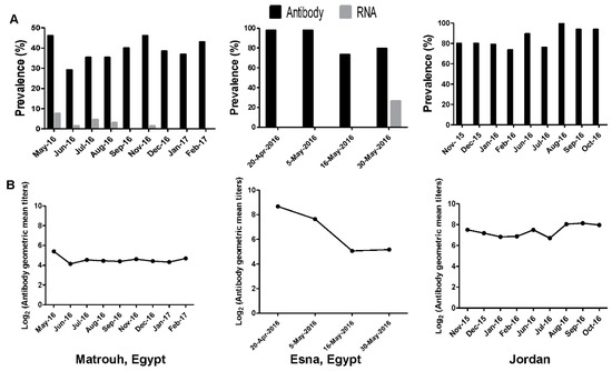 Longitudinal study to follow up the prevalence of MERS-CoV in two herds of camels in Egypt (Matrouh and Esna) and a herd in Jordan. (A) Indicates the seropositive rate of MERS-CoV in three herds and percentage of confirmed MERS-CoV RNA by RT-PCR. (B) indicates the geometric mean of antibody titers.