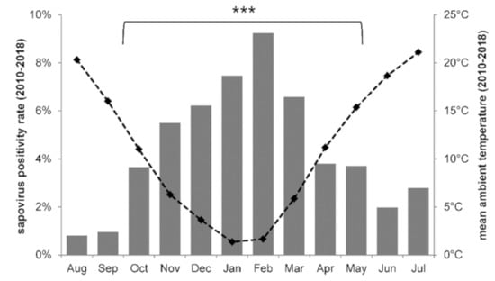 Average sapovirus stool positivity rate per month. Results from samples collected in 2010−2018 from diarrheic inpatients of less than five years of age (n = 1882) are shown by grey bars. The dashed black line indicates the local mean temperature per month during the sampling period. The sapovirus stool positivity rate in cold and warm months differed significantly (***, p ≤ 0.001).
