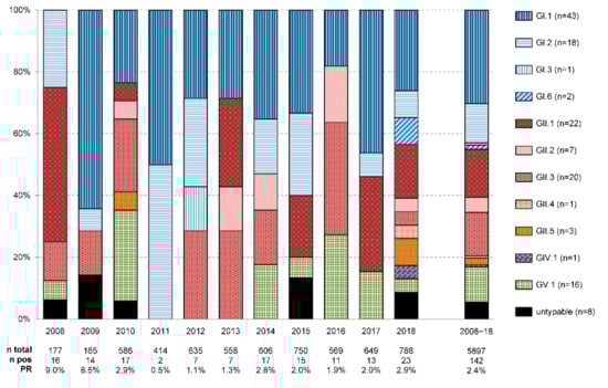 Sapovirus genotype distribution fluctuated during the study period (Figure 2). The detected diversity was highest in 2018, when at least ten different sapovirus genotypes were shown in the obtained stool samples. The overall prevailing GI.1 sapoviruses circulated in all years but 2008. In contrast, rare GI.3, GI.6, GII.4, GII.5 and GIV.1 strains were only detected in a single year each.