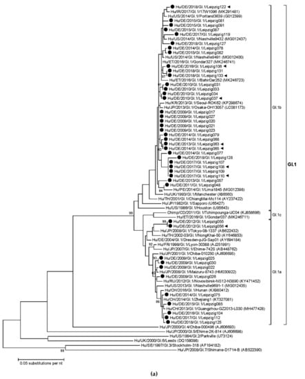 Within the sapovirus genotypes, variants from different intragenotypic lineages co-circulated (Figure 3). The partial VP1 gene nucleotide identity between the present GI.1 sapoviruses ranged from 94.4% to 100%. Viruses of the GI.1b lineage (n = 32) predominated over GI.1a strains (n = 11) (Figure 3a). Both intragenotypic lineages were detected in several sampling years. The present GI.1b sequences clustered with reference strains from multiple continents, including sapoviruses from Ireland, the USA, Ethiopia, Korea, Japan and Peru. A similar geographic distribution was shown for related GI.1a reference strains originating from Russia, the USA, China and Japan. For the present GI.1b strain Hu/DE/2018/GI.1/Leipzig128 recent travel history of the patient to Pakistan was recorded. The patient had returned from travel three days before hospital admission.