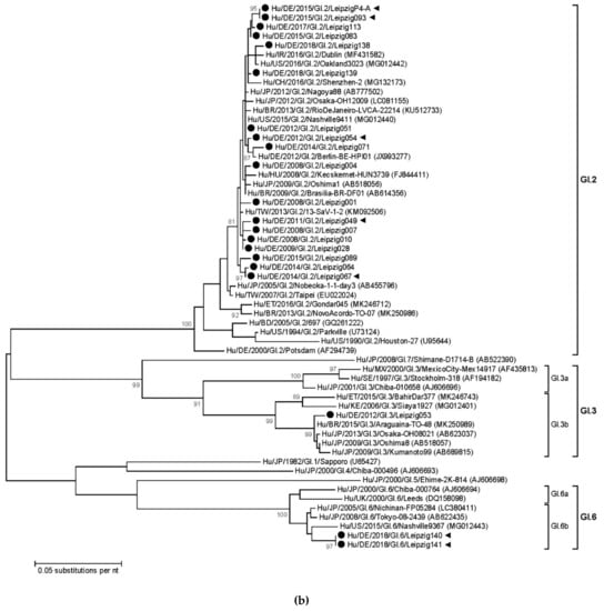 The nucleotide identity of the present GI.2 strains was high (98.0−100%). They were detected in eight of the eleven sampling years (Figure 2) and all belonged to one big phylogenetic cluster (Figure 3b). The majority of the recent reference sequences were part of the same phylogenetic cluster, too. A GI.3 strain was detected in 2012 and clustered in the intragenotypic lineage GI.3b. It was related to strains from Brazil and Japan, which had been collected during 2009−2015. Identical partial GI.6 VP1 sequences were obtained from two samples collected in 2018 from patients with nosocomial sapovirus infections. They belonged to the intragenotypic lineage GI.6b and clustered with a recent strain reported from the USA in 2015.