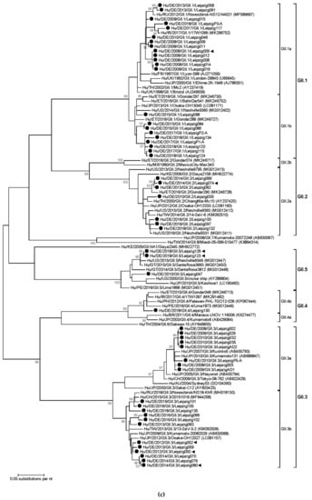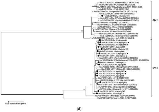 The genotype GIV.1 sapovirus was shown in one of the present patients. Its sequence from 2018 clustered with strains from the USA (nucleotide identities 98.7−98.8%) and Peru (nucleotide identity 99.1%), collected in 2014 and 2015, respectively (Figure 3d). All the present sixteen GV.1 sequences were highly homologous (97.3−100%), as were the majority of the available global reference sequences (Figure 3d).