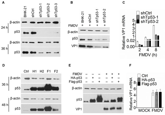 Moreover, we also constructed p53-overexpressing plasmids (HA-p53 and Flag-p53) to test the effects of p53 overexpression on FMDV replication. As shown in Figure 2D, p53 protein level is obviously up-regulated at both 36 h and 48 h after cells were transfected with HA-p53 (H1 and H2) or Flag-p53 (F1 and F2) plasmids, indicating the overexpression was successful. However, the VP1 protein level and RNA level were not significantly changed when p53 was obviously overexpressed (Figure 2E,F), demonstrating that overexpression of p53 does not have any significant effect on FMDV replication. These data suggested that only basal levels of p53 are efficient in regulating FMDV replication.