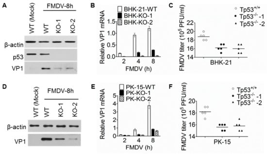 The following are available online at https://www.mdpi.com/1999-4915/11/8/727/s1, Figure S1: Characterization of p53 knockout (KO) cell lines, Figure S2: Genotyping of p53 knockout (KO) mice, Figure S3: Correlation of VP1 protein level with FMDV replication, Figure S4: FMDV infects mice peritoneal macrophages, Table S1: List of the primers used in this study.