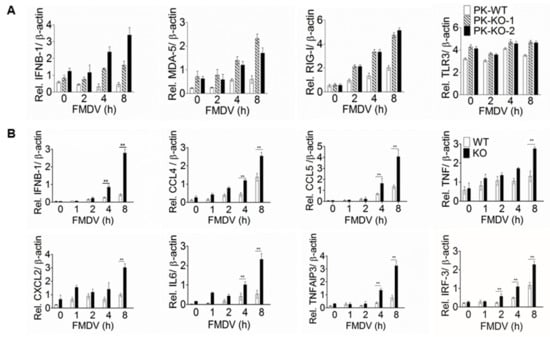 Recognition of viral nucleic acids with pattern recognition receptors (PRRs) is the first step to induce innate immune system [30]. Many RNA viruses replicate in the cytoplasm where they are sensed by the cytoplasmic TLRs, MDA5, and RIG-I. In a typical scenario, the viral RNA can be perceived by these PRRs to trigger the expression and release of interferons causing nearby cells to strengthen their antiviral response. It has been well-documented that p53 is involved in innate immune regulation through modulating the expression of the type-I IFN and the induction of various cytokines [31,32]. To investigate the effects of p53 on the innate immune response, we detected the relative expression level of IFNB-1 and the host sensors MDA5, RIG-I, and TLR3 in the p53-KO PK-15 cells after FMDV challenge. The results showed that after FMDV infection the expression level of IFNB-1, MDA5 and RIG-I in the p53-KO cells was clearly higher than that in the WT, while there are no obvious changes for TLR3 (Figure 4A).