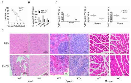 To investigate the effects of p53 on FMDV infection and replication in-vivo, WT and p53-KO mice were intraperitoneally infected with FMDV, and then the mice survival rate and the virus load were compared. As shown in Figure 5A, all of the WT mice died within 6 days, while the p53-KO mice showed a delayed death, surviving until 9 days after infection. RT-qPCR and TCID50 assay were also performed to detect the VP1 expression and virus titer. Results showed that compared to WT mice, the VP1 expression and virus titer were reduced in the heart, spleen, and muscle of p53-KO mice (Figure 5B,C). These results demonstrated that knockout of p53 inhibited FMDV replication in-vivo.