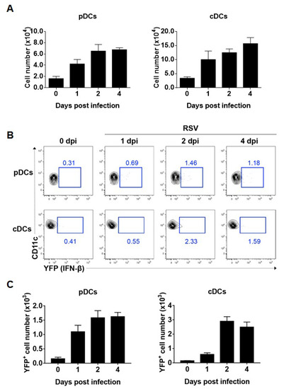 Both pDCs and DCs reside in lung mucosa and sense the presence of foreign antigens [21,22]. Both cell types are required for type I interferon production during RSV mucosal infection [8]. To determine whether pDCs or DCs produce interferon-β in the respiratory mucosa during RSV infection in vivo, we intranasally inoculated interferon-β/YFP reporter mice with RSV and analyzed RSV-infected innate immune cells in the lung. As a result, lung infiltrated pDCs and cDCs were increased after RSV infection (Figure 2A), and both pDCs and DCs produced interferon-β between 1 and 4 days post-infection (Figure 2B). After lung RSV infection, DCs capture RSV and moved into draining lymph nodes for T cell activation, but pDCs accumulate in the RSV-infected lung and secrete type I IFN [23]. Because such characteristics developed and considering both frequency and cell number (Figure 2B,C), we conclude that cDCs and pDCs are sufficient producers of interferon-β in the lung during RSV infection in vivo.