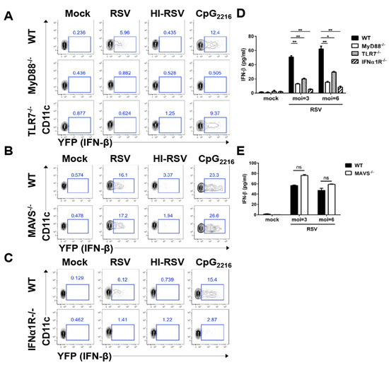3.3. RSV Induces pDCs to Produce Interferon-β via the TLR7-MyD88- and IFNα1R-Dependent Pathway