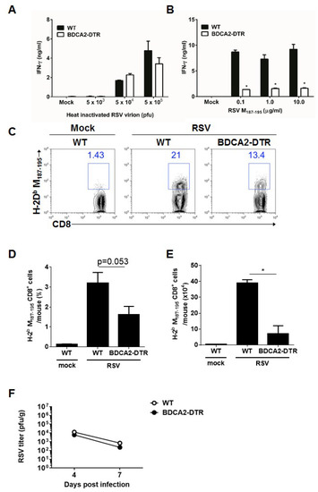 Type I IFNs is known to important cytokines for CD8+ T cell activation [25]. Also, pDCs play an critical role in CD8+ T cell activation through type I IFN secretion [26]. To investigate the role of pDCs in the adaptive T cell response against RSV infection, we used BDCA2-DTR mice for depletion of pDCs. After the BDCA2-DTR mice were depleted of their pDCs by treatment with diphtheria toxin, the mice were infected with RSV. pDC-depleted mice did not show any impairments in their CD4+ T cell responses but exhibited a considerably reduced cytotoxic T cell response (Figure 4A,B). Further, RSV-infected lungs from pDC-deleted mice had a decreased frequency and cell number of RSV M187–195 peptide-specific CD8+ T cells (Figure 4C–E). Next, we compared RSV titers during RSV infection at day 4 and 7 post infection. pDC-depleted BDCA2-DTR mice showed comparable RSV titers in lung (Figure 4F), and these results indicated that Th1 responses in pDC-depleted mice were sufficient to clear viruses while CTL responses were considerably reduced in this mice. Thus, these findings suggest that pDCs play a crucial role in the induction of the adaptive CTL priming response, as well as type I interferon production in early innate immunity.