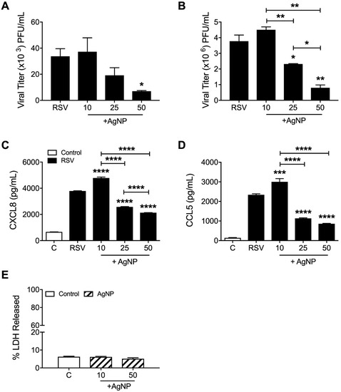 Silver nanoparticles (AgNPs) decreased respiratory syncytial virus (RSV) replication in epithelial cell lines. (A) A549 cells were infected with RSV or AgNP-RSV (0, 10, 25, or 50 μg/mL) at a multiplicity of infection (MOI) of 1 and (B) HEp-2 cells were infected with RSV or AgNP-RSV at an MOI of 0.01. Supernatants of infected cells were collected as described in the methods. Viral replication was determined by plaque assay and (C) CXCL8 and (D) CCL5 levels were determined by enzyme-linked immunosorbent assay (ELISA). (E) The toxicity of AgNPs (0, 10, and 50 μg/mL) on A549 cells was determined using LDH as an index of cellular damage. Data are expressed as mean ± SEM and is representative of three independent experiments. Significant results as compared to the RSV control are marked with asterisks, and additional comparisons between groups are indicated with brackets (* for p ≤ 0.05, ** for p ≤ 0.01, *** for p ≤ 0.001, **** for p ≤ 0.0001).