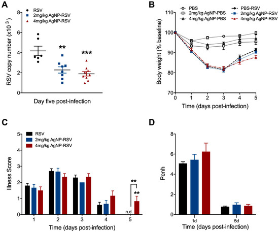 Over the course of the disease, mice were monitored daily for changes in clinical parameters (i.e., bodyweight loss and illness score). Mice inoculated with AgNP-PBS did not display any signs of disease or weight loss over the five-day monitoring period, indicating that AgNPs per se do not lead to clinical illness in mice. Mice inoculated with either dose of AgNP-RSV did not differ in bodyweight loss as compared to RSV untreated mice (Figure 2B). Mice inoculated with 4 mg/kg AgNP-RSV demonstrated a minor increase in illness score only at day five p.i. (Figure 2C). No other group had any significant changes in illness score over the five-day period.