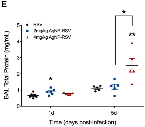 Next, to assess the effects of AgNPs on pulmonary function, airway obstruction was analyzed by whole-body plethysmography (Buxco Electronics, Inc., Sharon, CT, USA) and expressed as enhanced pause (Penh). Mice inoculated with either dose of AgNP-PBS had no notable changes to baseline Penh at day one or day five p.i. (data not shown). Mice inoculated with AgNP-RSV showed an increasing trend in baseline Penh values, but were statistically similar to the RSV untreated mice at both time points (Figure 2D). We also evaluated the concentration of total protein as a marker of epithelial damage and increased vascular permeability. At day 1 p.i., mice inoculated with 2 mg/kg AgNP-RSV demonstrated an average value of 0.89 mg/mL, which was a marginal increase compared to the RSV untreated group that demonstrated total protein levels of 0.66 mg/mL (Figure 2E). Mice inoculated with 4 mg/kg AgNP-RSV had total protein levels comparable to the RSV untreated mice. At day 5 p.i., mice inoculated with 4 mg/kg AgNP-RSV demonstrated a significant increase in total protein concentration with a value of 2.53 mg/mL as compared to 1.11 mg/mL for RSV untreated mice. Mice inoculated with 2 mg/kg AgNP-RSV had total protein levels comparable to the RSV untreated mice (Figure 2E).