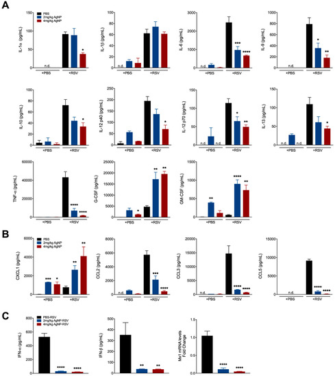 To investigate the immunomodulatory effects of AgNPs during RSV infection, cytokine and chemokine concentrations of the BALF at day one p.i. were evaluated by a multiplex cytokine array. In mice inoculated with AgNPs, regardless of infection status, G-CSF and GM-CSF were significantly increased (Figure 3A). Conversely, inflammatory and immunomodulatory cytokines, such as interleukin (IL)-1α, IL-6, IL-9, IL-10, IL-12p40, IL-12-p70, IL-13, and TNF-α were significantly decreased in mice inoculated with either dose of AgNP-RSV (Figure 3A). In addition to G-CSF and GM-CSF, the chemokine CXCL1 (KC) was significantly increased in all mice inoculated with AgNPs, regardless of infection status. Chemokines associated with viral replication, such as CCL3 (MIP-1α) and CCL5 (RANTES), were significantly decreased (Figure 3B).