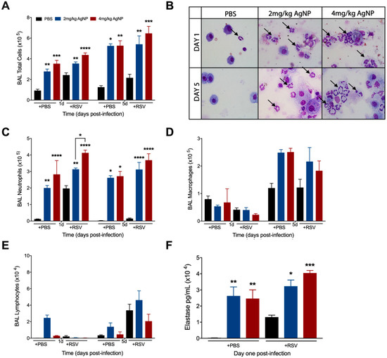 AgNPs increase recruitment and activation of neutrophils to the lung, regardless of infection status. Mice were inoculated with PBS, AgNP-PBS (2 mg/kg or 4 mg/kg), RSV (5 × 106 PFU) or AgNP-RSV. At days one and five p.i., BALF was collected from all groups and used to obtain (A) total cell counts, as well as differential cell counts consisting of (C) neutrophils, (D) macrophages, and (E) lymphocytes. (B) BALF samples collected at days one and five p.i. from PBS untreated and AgNP-PBS mice were spun on glass slides, stained with H&E, and observed under a light microscope at 40× magnification. The black arrows indicate neutrophils. (F) Neutrophil elastase concentrations were measured by ELISA using BALF collected at day one p.i. Data are expressed as mean ± SEM (n ≥ 6 mice) and is representative of three independent experiments. Significant results as compared to the respective control are marked with asterisks, and additional comparisons between groups are indicated with brackets (* for p ≤ 0.05, ** for p ≤ 0.01, *** for p ≤ 0.001, **** for p ≤ 0.0001).