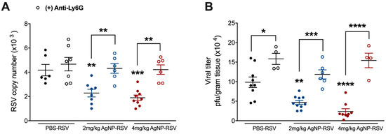 Some studies have shown AgNPs to increase neutrophil cell counts within the BALF of treated mice, but few have investigated their activity following recruitment [38,39]. Neutrophils have also been suggested to have antiviral capabilities during RSV infection, leading us to evaluate the function of neutrophils in AgNP-RSV treated mice. Mice were depleted of neutrophils with an injection of anti-Ly6G clone 1A8 12 h prior to inoculation with RSV (5 × 106 PFU), or AgNP-RSV. In neutrophil-depleted mice inoculated with 2 mg/kg AgNP-RSV or 4 mg/kg AgNP-RSV, the viral copy number at day five p.i. was found to be similar to the viral copy number in neutrophil-depleted RSV untreated mice, indicating a reversal of the antiviral effect noted in immunocompetent mice (Figure 5A). This was further supported by a viral plaque assay using the lung homogenate of infected mice (Figure 5B). These results support neutrophils as a primary mechanism of the antiviral activity generated by AgNPs against experimental RSV infection in mice.