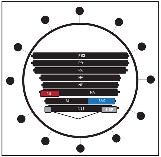 Schematic illustrating unique influenza B virus proteins. The RNA genome of the segmented influenza B virus (not to scale) with the unique gene products (relative to other influenza viruses) shown in color. Abbreviations: PB2—polymerase basic protein 2, PB1—polymerase basic protein 1, PA—polymerase acidic protein, HA—hemagglutinin, NP—nucleoprotein, NB—glycoprotein NB, NA—neuraminidase, M1—matrix protein, BM2—BM2 protein, NS1—non-structural protein 1, NEP—nuclear export protein.