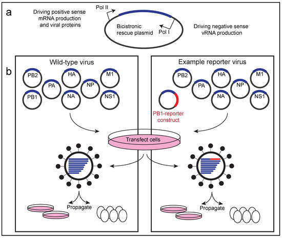 Schematic outlining influenza virus reverse genetic systems. (a) Bi-cistronic plasmid that drives expression of positive-sense viral mRNA for gene transcription and negative-sense viral RNA for genomic replication. (b) Transfection of an eight-plasmid system (one plasmid per viral genomic segment) allows production of recombinant wild-type virus. Alternatively, genomic segment plasmids containing reporter constructs can be introduced in place of wild-type (WT) segments to generate viruses harboring reporter genes.