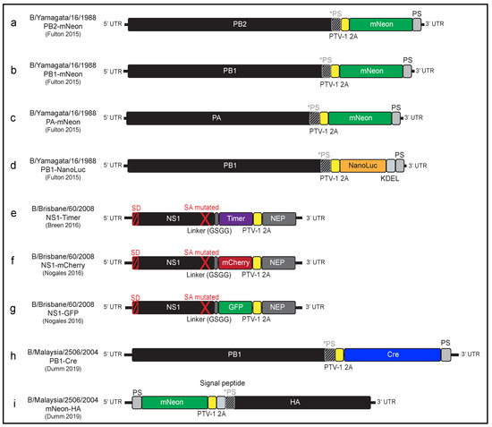 Designs of published influenza B virus genomic segments harboring reporter genes. (a–c) mNeon expressed in each of the polymerase subunit segments (d) NanoLuc expressed in the PB1 segment (e–g) Fluorescence proteins expressed in the NS1/NEP segment (h) Cre recombinase expressed in the PB1 segment (i) mNeon expressed in the HA segment. Abbreviations: PB2—polymerase basic protein 2, PB1—polymerase basic protein 1, PA—polymerase acidic protein, HA—hemagglutinin, NS1—non-structural protein 1, NEP—nuclear export protein. GFP—green fluorescent protein, UTR—untranslated region, *PS—silently mutated packaging signal, PS—duplicated packaging signal, PTV-1 2A—porcine teschovirus 2A sequence for co-translational separation, KDEL—endoplasmic reticulum retention sequence to prevent secretion, SD—Splice donor site, SA mutated—mutated Splice acceptor site.