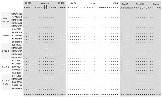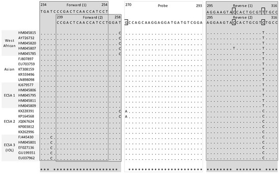 A total of seven assays were retrieved from the PubMED search [9,10,11,12,13,14,15]. Specific attention was given to mismatches located in the five nucleotides places at the 3′ extremity because of their ability to prevent correct hybridization. In probes, one or two mismatches generally do not compromise the hybridization potential but this also depends on the length of the probe and its G + C content. When compared with the 25 sequence alignments, two assays clearly provided a lower number of mismatches and mismatches that were not located in critical position. Detailed analysis had also been performed in a recent article, the leading author of which is one author of this study [8]. The first system, (Pastorino et al., 2005) designed to detect CHIKV strains belonging to both African and Asian lineages, consists of two primers and one probe which are located at the 3’ untranslated region [9]. Comparison with sequence alignment showed one possible mismatch within the forward primer with one strain belonging to the ECSA1 lineage at a position that is of little influence for hybridization (Figure 1). There was no mismatch within either the reverse primer or the probe. The second system, (Panning et al., 2006) consists of one fluorogenic probe and two sets of sense and reverse primers targeting the nsp1 gene: One set of primer is adapted to all CHIKV lineages, whereas the second one is best suited for strains belonging to the Indian Ocean lineage [10]. Few mismatches were observed in the in silico analysis, especially between the first couple of primers and ECSA3 strains sequences; however, the presence of a second set of primers complements the possible flaws of the first set (Figure 2).