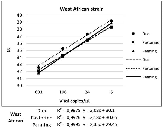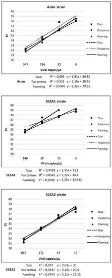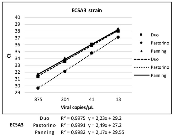The results about the analytical sensitivity test obtained with the Duo CHIKV RT-qPCR test were compared to results of the mono-target assays, Pastorino and Panning (Table 3), in order to evaluate the correlation between Ct values and the six different CHIKV concentrations previously tested. The response (Ct) for the three systems is linear, with correlation coefficient (R2) close to one for all CHIKV strains. Results are detailed in Figure 3.