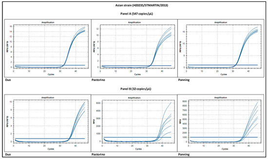 Intensity of fluorescence signal of CHIKV Asian strain at high (A) and low (B) RNA copy number.
