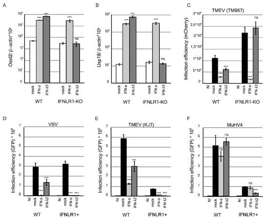 Interferon-stimulated gene (ISG) expression and antiviral activity in response to IFN-λ treatment in WT and IFNLR1-overexpressing LKR10 cells. (A,B) Amounts of Oasl2 (A) and Usp18 (B) per 106 β-actin cDNA copies detected in wild-type (WT) and IFNLR1-KO LKR10 cells 24 h after treatment with mouse IFN-αA, IFN-λ3, or control medium (mock). (C) Infection efficiency in WT and IFNLR1-KO LKR10 cells measured by flow cytometry 24 h post-infection with 0.5 PFU/cell of TM967. Cells were pretreated with mouse IFN-αA, IFN-λ3, or mock for 7 h prior to infection. (D–F) Infection efficiency in WT and IFNLR1-overexpressing (IFNLR1+) LKR10 cells measured by flow cytometry 8 h post-infection with 0.25 PFU/cell vesicular stomatitis virus (VSV)–GFP (D); or 24 h post-infection with 2.5 PFU/cell KJ7 (E) or 1 PFU/cell murid herpesvirus-4 (MuHV-4)–GFP (F). Cells were pretreated with mouse IFN-αA, IFN-λ2 or control medium for 7 h prior to infection. (A–F) 100 U/mL IFN-αA, 700 pg/mL IFN-λ3, and 1 ng/mL IFN-λ2 were used for treatment. *** p < 0.001. ns: non-significant in one-way ANOVA (Dunnett’s test) comparing each group to the mock-treated group.
