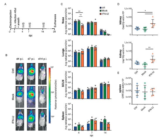 Bioluminescence analysis of MuHV-4 after intranasal inoculation under general anesthesia in mock or IFN-λ-treated mice. (A) Eight week-old female BALB/c mice were electroinjected with an empty plasmid (mock, n = 5) or a plasmid expressing IFN-λ2 (IFN-λ2, n = 5). A control group (ctrl, n = 5) was left untreated. Two days later, mice were infected intranasally with 104 PFU Luc+ MuHV-4 in 40 μL under general anesthesia and imaged at the times indicated. (B) Representative images are shown for ctrl, mock or IFN-λ2 electroinjected groups at days four, seven, and 14 post infection (p.i.) (C) Signal intensities were compared for the nose, lungs, superficial cervical lymph nodes (SCLNs) and spleen between groups. The signal was determined by measuring equivalent regions of interest and subtracting the right abdominal signal as a negative background. The graphs show mean and individual values. (D) Amounts of Oasl2 and Usp18 per 106 β-actin cDNA copies detected in the left kidney of mice at the time of sacrifice. (E) Viral genome copy numbers (ORF25) per 106 β-actin copies in spleen at the time of sacrifice showed no significant difference between groups. (C–E) Two-way (C) and one-way (D,E) ANOVA: * p < 0.05 and ** p < 0.01; no mark—no significant difference.