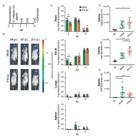 Bioluminescence analysis of MuHV-4 after intranasal inoculation without anesthesia in mock or IFN-λ-treated mice. (A) Eight week-old female BALB/c mice were electroinjected with an empty plasmid (mock, n = 10) or a plasmid expressing IFN-λ2 (IFN-λ2, n = 10). Two days later, alert mice were infected by intranasal (i.n.) injection with 5 × 104 PFU Luc+ MuHV-4 in 5 μL and imaged at the times indicated. (B) Representative images are shown for mock or IFN-λ2 electroinjected groups at days four, seven, and 11 p.i. (C) Signal intensities were compared for the nose, superficial cervical lymph nodes (SCLNs), lungs, and spleen between groups. (D) Amounts of Oasl2 and Usp18 transcripts per 106 β-actin copies detected in the left kidney of non-infected (NI, n = 3), mock, or IFN-λ2-treated mice at the time of sacrifice. (E) Viral genome copy numbers (ORF25) per 106 β-actin copies in spleen at the time of sacrifice showed no significant difference between groups. (C) Student’s t-test was used to compare mock and IFN-λ-treated mice. In this analysis, one outlier defined by a Grubs’ test (p < 0.01) was ignored, which strengthened the significance from * to **. (D,E) One-way ANOVA: * p < 0.05, ** p < 0.01 and *** p < 0.001; no mark—no significant difference.