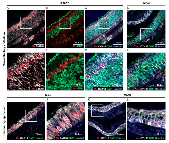 IFN-λ responsive cells in the olfactory epithelium. (A–L) Representative sections of the olfactory and respiratory nasal epitheliums labeled for Mx1 (red), olfactory marker protein (OMP) (neurons, green) and CYK18 (sustentacular cells, white). Where indicated, nuclei were stained with Hoechst dye (blue). Sections were from B6.A2G-Mx1-IFNAR1−/− female mice, seven days after electroinjection of an empty plasmid (n = 4) or a plasmid expressing IFN-λ2 (n = 4). (A–C,E–G) Representative sections of the olfactory epithelium of IFN-λ plasmid-treated mice revealing extensive Mx1 staining in sustentacular cells but not in neurons. (D,H) Little Mx1 expression in the olfactory epithelium of mock-treated mice. (E–H) Images zoomed-in from the upper panel (white square). (I–L) Extensive Mx1 expression in the respiratory epithelium of IFN-λ-treated mice (I–J) compared to mock-treated mice (K,L). (J,L) Images zoomed-in from the corresponding left panels (white square).