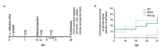 In a preliminary experiment, three groups of BALB/c female mice (n = 10) were infected intranasally with Luc+ MuHV-4 under general anesthesia. After establishment of latency, a control group was left untreated while the two others were electroinjected with either an empty or an IFN-λ2-expressing plasmid (Figure 5A). IVIS measurements at 7 and 14 d.p.i. confirmed the expected propagation of the virus from the lungs to the lymphoid organs in all mice. IFN-λ expression in the group that received the IFN-λ2 plasmid was confirmed by a significant ISG upregulation in the kidney and in the genital tract at 28 d.p.i.. Infection of mice was confirmed by viral genomic DNA detection in the spleen at the time of sacrifice.