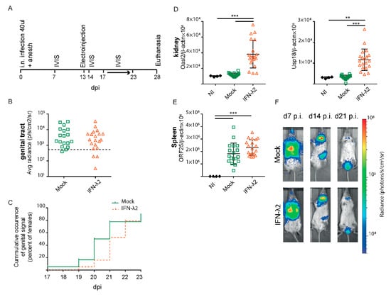 MuHV-4 reactivation in the genital tract despite IFN-λ treatment. (A) Same experiment as in Figure 5 with mock (n = 20) and IFN-λ2-treated (n = 20) mice and an extended luciferase imaging time to assess a potential delay in the genital reactivation. (B,C) No significant difference was observed between groups in the maximal genital signal (B) and in the time of occurrence of a genital signal (C) from day 17 to 23 p.i. Positive signals were taken as those that were >2 standard deviations above the mean for 10 uninfected mice (threshold represented by the dashed line). (D) Amounts of Oasl2 (left) and Usp18 (right) transcripts per 106 β-actin copies detected in the left kidney of non-infected (NI, n = 4), mock, or IFN-λ2-treated mice at the time of sacrifice. (E) Viral genome copy numbers (ORF25) per 106 β-actin copies in spleen at the time of sacrifice showed a significant difference between groups. (F) Representative images are shown for mock or IFN-λ2 electroinjected groups at days seven, 14, and 21 p.i. (B,D,E) Student’s t-test (B) and one-way ANOVA (D–E): p < 0.01 and *** p < 0,001; no mark—no significant difference. (C) Log Rank test (Mantel–Cox): p > 0.05.