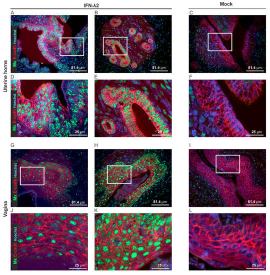 IFN-λ-responsive cells in the genital tract. (A–L) Representative sections of the uterine horns and vaginas showing Mx1 expression (green) and E-cadherin+ epithelial cells (E-cadh, red) seven days after electroinjection of B6.A2G-Mx1-IFNAR1−/− female mice with an empty plasmid (Mock, n = 4) or a plasmid expressing IFN-λ2 (n = 4). (A–F) Representative sections of the uterine horns revealing extensive Mx1 expression in the E-cadherin positive cells of two IFN-λ-treated (A,B) compared to the mock-treated (C) mice. (D–F) Images zoomed-in from the upper panel (white rectangle). (G–L) Representative sections of the vaginal epithelium revealing partial (G–J) versus extensive (H–K) Mx1 expression in the E-cadherin positive cells of two IFN-λ-treated mice and little Mx1 expression in the E-cadherin positive cells of mock-treated mice (I–L). (J–L) Images zoomed-in from the upper panel (white rectangle).