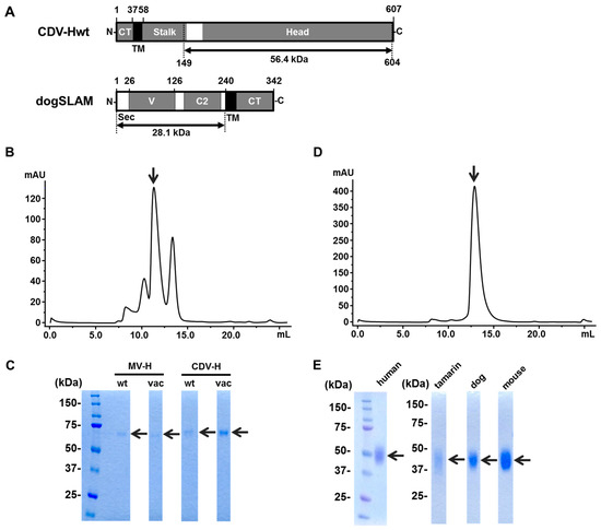 Expression and purification of canine distemper virus hemagglutinin (CDV-H) and dog signaling lymphocyte activation molecule (SLAM) proteins. (A) Schematic images for the domains of CDV-H (top) and dog SLAM (bottom). CT: Cytoplasmic tail, TM: Transmembrane domain, Head: Globular head domain, Sec: Secretary signal sequence, V: V-set domain. The arrows indicate the expression regions. (B) Gel filtration chromatograph of CDV-Hvac head domain. The arrow indicates the fraction of CDV-Hvac. (C) Sodium dodecyl sulfate polyacrylamide gel electrophoresis (SDS-PAGE) analysis of purified hemagglutinins (H) proteins (MV-Hwt, MV-Hvac, CDV-Hwt, and CDV-Hvac) in reduced condition. (D) Gel filtration chromatograph of dog SLAM. The arrow indicates the fraction containing soluble dog SLAM. (E) SDS-PAGE analysis of purified SLAM proteins (human, tamarin, dog, and mouse) in reduced condition. The arrows indicate the protein bands corresponding to each protein.