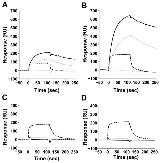 Binding of SLAM proteins to measles virus (MV) and CDV-H from the wild-type and vaccine strain. Human (gray solid line), tamarin (solid line), dog (broken line), and mouse SLAM (gray broken line) were injected for 120 s through flow cells bound with (A) MV-Hwt (641 RU), (B) MV-Hvac (1651 RU), (C) CDV-Hwt (574 RU), and (D) CDV-Hvac (776 RU). As a negative control, the response of HLA-G immobilized flow cells was subtracted.