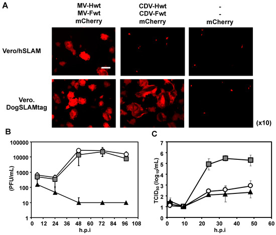 Infectious activity of MV toward Vero cells expressing human or dog SLAM. (A) Syncytium formation of SLAM-expressing Vero cells co-transfected with a combination of H, fusion (F), and mCherry expression plasmids. MV-H and -F of the wild-type IC-B strain, and CDV-H and -F of the wild-type A75/17 strain were used. Fluorescent images were acquired at 42 h after transfection. The scale bar indicates 400 µm. (B) Growth kinetics of the recombinant MV IC323 strain in Vero/hSLAM (open circles), Vero.DogSLAMtag (grey squares), and Vero cells (closed triangles). The data represent the means ± standard deviations of the results from triplicate samples. (C) The growth kinetics of the CDV Ac96I strain is shown in the same manner as Figure 3B. The data represent the means ± standard deviations of the results from triplicate samples.