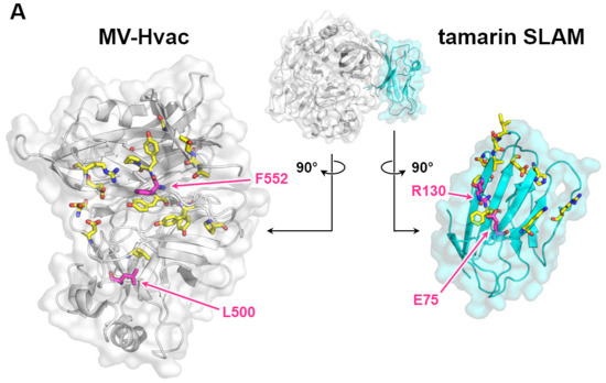 - Hashiguchi, T.; Ose, T.; Kubota, M.; Maita, N.; Kamishikiryo, J.; Maenaka, K.; Yanagi, Y. Structure of the measles virus hemagglutinin bound to its cellular receptor SLAM. Nat. Struct. Mol. Biol. 2011, 18, 135–141. [Google Scholar] [CrossRef]