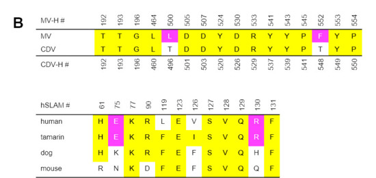 The following are available online at https://www.mdpi.com/1999-4915/11/8/761/s1, Figure S1: Kinetic Analysis of SLAM proteins against MV-H and CDV-H from the wild-type and vaccine strain.