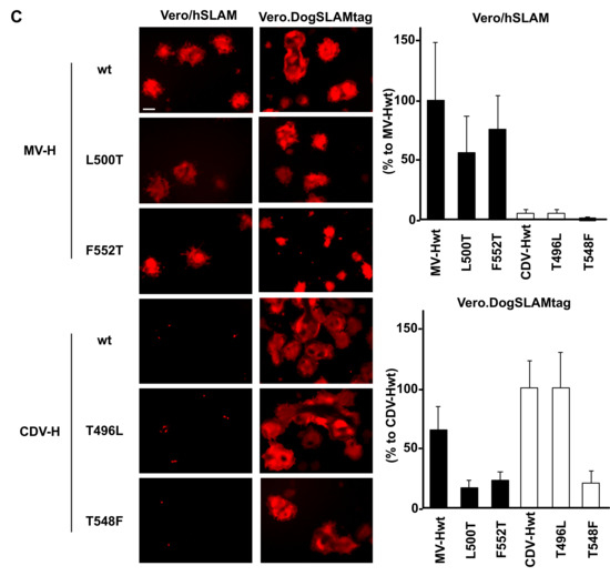 To confirm the capability of different SLAM receptor usage by MV- and CDV-H, we performed a cell-to-cell fusion analysis. DNA fragments, encoding the full-length of the H and F protein of the wild-type MV and CDV, were each sub-cloned into a pCA7 vector [16]. Vero/hSLAM and Vero.DogSLAMtag cells, in a 48-well plate, were co-transfected by 0.6 µg of polyethyleneimine max with the combination of 0.1 µg of H, F, and mCherry-expressing plasmids [18,19]. Since the vaccine strains of MV and CDV can fuse parental Vero cells, we used the combination of H and F proteins of the IC-B strain for wild-type MV, and the A75/17 strain for CDV. Fluorescent images were acquired with a BZ-X700 fluorescent microscope (Keyence Corporation, Osaka, Japan) with a 2× objective at 42 h post-transfection time.