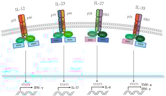Kobayashi et al. first discovered natural killer cell stimulatory factor (NKSF) in 1989 [], which was initially named IL-12. IL-12 has a heterodimeric structure comprising an α-subunit (IL-12p35) and a β-subunit (IL-12p40). IL-12 recognizes its receptors, IL-12Rβ1 and IL-12Rβ2, leading to the binding of Non-receptor tyrosine-protein kinase (TYK2) and Janus kinase 2 (JAK2), respectively, mainly in order to induce signal transducer and activator of transcription 4 (STAT4), which is necessary for IL-12 function []. Many studies have clearly demonstrated that IL-12 enhances the connection between the innate and adaptive immune responses.