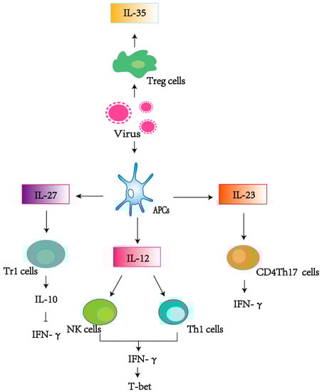 IL-12 family members mediate the immune responses when virus enters into cells. Viral infection contributes to expression of IL-12, IL-23, IL-27, and IL-35 by activating antigen-presenting cells (APCs) or regulatory T (Tregs) cells. IL-12, IL-23, and IL-35 are active in the promotion of inflammatory responses, and IL-27 can function as a kind of anti-inflammatory cytokine. Overall, the IL-12 family of cytokines is indispensable for virus clearance by regulating IFN-γ and other cytokines.
