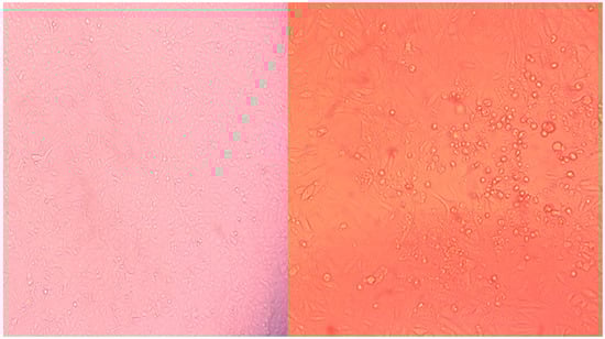 Cell cultures illustrating cytopathic effect (CPE) in the sequenced culture with Moskva (right) relative to the control (left).
