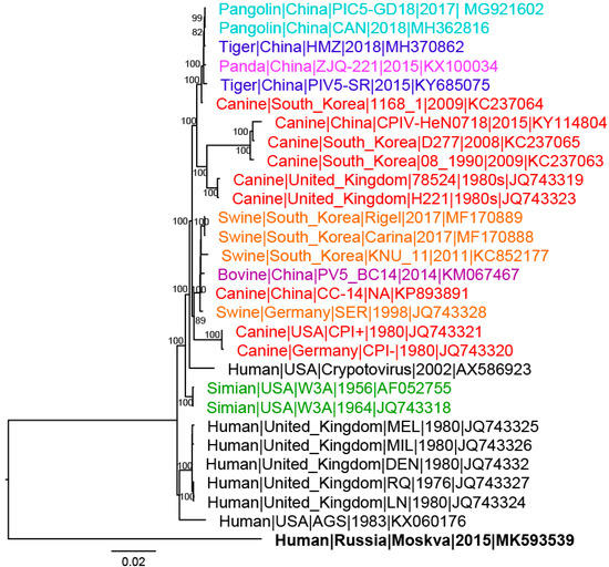 Whole genome phylogenetic tree of Mammalian orthorubulavirus 5 (PIV5) strains. Bootstrap values greater than 70 are shown at major nodes. Strains are colored according to host with black representing human strains; red, canine; orange, swine; green, simian; teal, pangolin; blue, tiger; pink, panda; and purple, bovine. Moskva is in bold.
