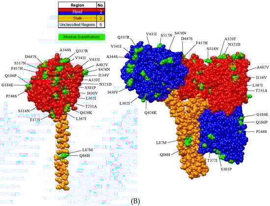 The PIV5 genome encodes two glycoproteins, F and HN, which are essential for viral attachment, fusion, and entry. With Moskva exhibiting human origin, the F and HN amino acid sequences of Moskva were compared to the F and HN of human strains. The protein models illustrated the location and magnitude of substitutions using SWISS-MODEL (Swiss Institute of Bioinformatics, Lausanne, Switzerland; F, 4jf7.1; HN, 4wsg.1), Phyre2 (Imperial College London, London, UK; F, c2b9bA; HN, c4jf7B), and Chimera (Resource for Biocomputing, Visualization and Informatics, University of California, San Francisco, CA, USA). Consistent with Moskva’s evolutionary divergence, the F and HN proteins of Moskva had more residue substitutions (32 and 31, respectively) relative to consensus sequences of human PIV5 strains (Figure 3A). Of the 32 Moskva F protein substitutions, the majority of the substitutions (n = 25) occurred in unclassified regions of PIV while 5 and 2 substitutions occurred in domains I and III, respectively [,]. Domain II (including the hydrophobic loop), the fusion peptide, and heptad repeat region B (HRB) lacked residue substitutions in Moskva [,]. The hydrophobic loop plays a crucial role interacting with the HN protein for fusion activation, and the region is conserved in all the strains of Paramyxoviridae [,]. In the HN protein, the stalk was more conserved than the head, with 23 residue substitutions in the head versus only two substitutions in the middle of the stalk (Figure 3B). The stalk interacts with the F protein for fusion, and residue substitutions in the stalk near the head of the protein are less detrimental than those substitutions further from the head of the protein []. Alterations in the F and HN glycoproteins further represented the divergence of Moskva while supporting regions of conservation.