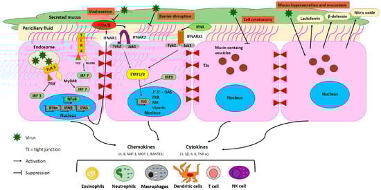 Direct and indirect effects of viral infections of the airway epithelium. Upon entrance into the cell, viruses are recognized by the Toll-like receptor (TLR) on either cell membrane or in endosomes. TLRs activate interferon regulatory factors (IRFs) leading to IFN-α and IFN-β release via the Toll/IL-1 receptor domain-containing adaptor (TRIF). TLR3 stimulates IRF-7 and NF-κB via MyD88 activation, leading to the release of proinflammatory cytokines and the production of IFN-α, -β, and -λ, respectively. Secretion of proinflammatory cytokines and chemokines activate the immune system, through recruitment of eosinophils, neutrophils, macrophages, dendritic cells, T cells, and NK cells. Most respiratory viruses have developed strategies to escape antiviral defense, mainly by interfering with the IFN system or by affecting the epithelium barrier, with the consequence of a loss of integrity and protection. Furthermore, respiratory viruses can perturb (skewed or exaggerated) inflammatory responses and production of soluble mediators.