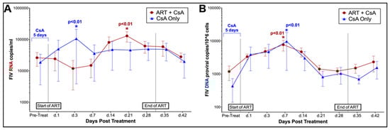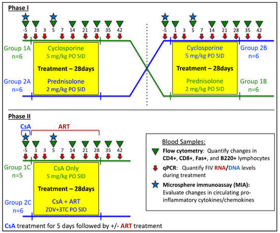 Phase II: Following a 6-week wash-out period from Phase I, all FIV-infected cats were pre-treated with CsA for 5 days prior to day 0, after which CsA treatment ceased and a subset of cats were then administered ART for 28 days. As outlined in Figure 1, FIV-positive cats were divided into 2 randomized groups and treated as follows: Group 1C—(CsA Only, n = 5) CsA at 5 mg/kg PO SID for 5 days prior to day 0; Group 2C—(CsA + ART, n = 6) CsA at 5 mg/kg PO SID for 5 days prior to day 0, followed by zidovudine (ZDV) 10 mg/kg + lamivudine (3TC) 50 mg/kg, PO BID for 28 days. Blood samples were collected for qPCR, CBC, and flow cytometry analysis as outlined in Figure 1 [,].