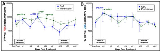 Phase I. Quantitative PCR analysis of plasma detected FIV RNA in study animals prior to treatment with both prednisolone and CsA, and at all time points during and following treatment (Figure 2). Changes in FIV viral copies per mL of plasma were compared over time to detect changes in RNA viral load during treatment. Although FIV RNA viral loads did not differ over time between treatment groups in this study, significant differences in FIV RNA were detected at individual time points when compared to pre-treatment FIV RNA viral loads. Levels of FIV RNA were significantly elevated in plasma of prednisolone-treated cats at days 1, 7, and 14 during treatment, and were also transiently increased at day 7 of CsA treatment (Figure 2A). Similarly, FIV proviral DNA loads did not differ between treatment groups over time; however, levels of FIV DNA were significantly increased in PBMCs of both prednisolone- and CsA-treated cats at 1 day of treatment (Figure 2B).