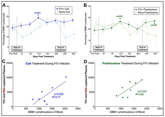 Phase I. Flow cytometry was used to evaluate changes in the percentage of lymphocytes positive for CD4, CD8, Fas, and B220 surface antigens over time in FIV-infected and naïve cats. Changes in FIV-infected cats were compared to baseline values and data from naïve control cat samples to compare alterations in lymphocyte immunophenotype in response to treatment and in the presence of FIV infection. Overall, the percentage of CD4+ lymphocytes differed significantly over time in FIV-infected cats treated with both CsA (interaction, p = 0.05) and prednisolone (interaction, p = 0.03) when compared to FIV-negative control cats. Post-hoc analyses indicated that FIV-infected cats exhibited transient increases in CD4+ lymphocytes at 14 days of treatment with both CsA (p = 0.004) and prednisolone (p = 0.05) when compared to baseline data (pre-treatment) (Figure 4A,B). When compared to FIV viral and proviral loads, a significant positive correlation was observed between numbers of CD4+ lymphocytes and circulating copies of FIV RNA in CSA (p = 0.025) and prednisolone-treated cats (p = 0.037) (Figure 4C,D). Although the proportion of CD4+ lymphocytes was decreased in naïve control animals at day 1 of CsA treatment and immediately following cessation of treatment (day 35) when compared to baseline data (pre-treatment), changes in this group were not statistically significant, and the percentage of CD4+ lymphocytes did not differ over time during CsA and prednisolone treatment in control animals.