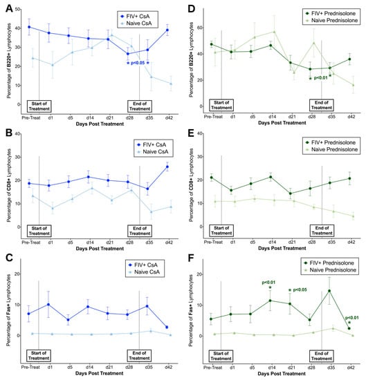 When compared to naïve controls, the proportion of B220+ lymphocytes differed significantly over time in FIV-infected cats treated with CsA (interaction, p = 0.02) and prednisolone (interaction, p = 0.02) (Figure 5A,D), and the proportion of B220+ lymphocytes gradually decreased in FIV-infected cats treated with both compounds. A reverse trend was observed in CsA-treated animals, with an apparent increase in B220+ lymphocytes over time in the naïve control group. However, changes in B220+ lymphocyte percentage were not statistically significant in naïve animals when compared to baseline data. In contrast with changes in CD4+ lymphocytes, FIV-infected cats exhibited significant decreases in B220+ lymphocytes after 28 days of treatment with CsA (p = 0.033–0.013) and after 21 days of prednisolone (p = 0.034–0.005). No significant differences were detected in CD8+ lymphocytes between FIV-infected cats and naïve controls or in response to CsA or prednisolone treatment (Figure 5B,E), and Fas+ lymphocytes did not differ between FIV-infected and naïve cats treated with CsA (Figure 5C). However, the percentage of Fas+ lymphocytes differed significantly over time in FIV-cats treated with prednisolone (p = 0.037) compared to naïve controls, and post-hoc analysis revealed transient increases in Fas+ lymphocytes at 14 days (p = 0.004) and 21 days (p = 0.016) of prednisolone treatment, followed by a significant spike in Fas+ cells with cessation of treatment (day 35, p < 0.0001) (Figure 5F). The percentage of CD8+, B220+, and Fas+ lymphocytes did not differ over time during CsA and prednisolone treatment in naive control animals.